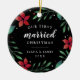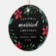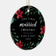 Celebre seu primeiro Natal como um casal casado com este adorno charmoso e festivo. A design apresenta o "primeiro Natal casado" e o ano em caracteres brancos, rodeados de flores de poinsettia vermelha e folhagem de férias verdes. Adicione uma foto ao verso com embelezamentos botânicos de feriado correspondentes.