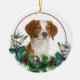 Na frente deste ornamento de Feriado está um belo retrato de um cachorro britânico vermelho e branco espreitando de uma tosse sagrada e verde. Morangos vermelhos e cones de pínus decoram os sprigs de pinho e sprigs de pinho. A imagem é colocada em um círculo branco dentro de um círculo fino de linha vermelha. A parte de trás do ornamento tem a mesma coroa verde e círculo com seu texto personalizado em vermelho.