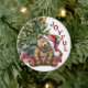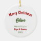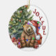 Na frente deste ornamento Feriado está um urso marrom adorável vestindo um chapéu de Papai Noel vermelho e branco. O urso senta-se em frente a uma árvore decorada de Férias, e é envolto em uma corda de luzes festivas. O texto vermelho do lado diz "JOVEM". No verso, o texto vermelho e verde diz MERRY CHRISTMAS", e há campos de texto adicionais para você personalizar. É maravilhoso dar a um neto, neta, filho ou filha.