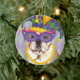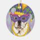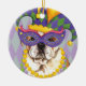 O filhote de cachorro bonito do buldogue, vestido na máscara festiva, chapéu do bobo da corte e miçanga, apronta-se para o divertimento no carnaval ou em qualquer outro momento. Grande presente para o senhor mesmo e seus família e amigos Buldogue-loving.