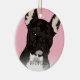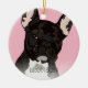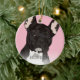 Enfeite de natal de bulldogue francês inspirado em pop art excêntrico apresentando um cão bulldogue francês preto brindle em um fundo rosa pastel que pode ser alterado para qualquer cor, adicione o nome do seu animal de estimação.