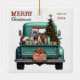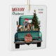 Um caminhão de coleta de retro azul lacrimogêneo carregar uma árvore de Natal decorada e pacotes de presentes neste Enfeites de natal de vidro bonito. Olhar para fora do portão é um lindo cachorro Bullmastiff vestindo um chapéu de Papai Noel vermelho e branco. Um cartaz de madeira rústico na pára-choque diz "Feliz Natal". O texto vermelho e verde estilizado no topo à esquerda diz "MERRY CHRISTMAS", com seu nome (ou do seu cachorro) e o ano à direita. Ambos os lados têm a mesma imagem.