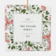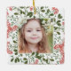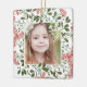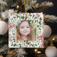 Um ornamento de feriado moderno e elegante que enquadra sua foto quadrada favorita em um quadro perfeitamente detalhado com minúsculas amoras vermelhas e folhagem de inverno verde em um fundo branco. Personalize a parte de trás deste único ornamento fotográfico de Natal com o seu nome familiar e o ano.