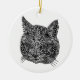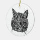 Cabeça ornamental branca e negra de um gato, inspirada num animal vivo e originalmente desenhada com caneta no papel.