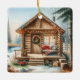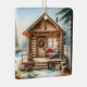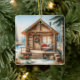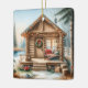 Enfeites de natal personalizado. Pequena e pequena cabana festiva com um fundo de floresta nevada.