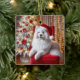 Um cão Samoyed branco e fluffy vestindo um Pai Natal sentado numa cadeira vermelha ao lado de uma árvore de Natal maravilhosamente decorada Todo o texto pode ser alterado ou apagado.