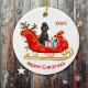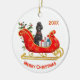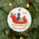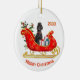 Um cão preto majestoso de Poodle senta-se entre pacotes de presentes brilhantemente embrulhados num ornamentado de trenó de Natal vermelho e dourado. No topo está um campo de texto que pode ser personalizado para o seu nome ou o ano atual. Na parte inferior está outro campo de texto personalizado que diz "Feliz Natal". Ambos os lados do ornamento têm a mesma imagem.