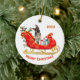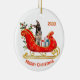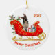 Um German shepherd adorável Cachorro se senta entre pacotes de presentes brilhantemente embrulhados em um ornamentado vermelho e uma trenó de Natal dourado. No topo está um campo de texto que pode ser personalizado para o seu nome ou o ano atual. Na parte inferior está outro campo de texto personalizado que diz "Feliz Natal". Ambos os lados do ornamento têm a mesma imagem.