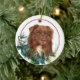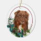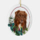 Na frente deste ornamento Holiday está um retrato de um lindo Cachorro Australiano Vermelho escondido de uma tosse sagrada e verde. Morangos vermelhos e cones de pínus decoram os sprigs de pinho e sprigs de pinho. A imagem é colocada em um círculo branco dentro de um círculo fino de linha vermelha. A parte de trás do ornamento tem a mesma coroa verde e círculo com seu texto personalizado em vermelho.