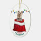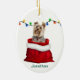 Na frente deste ornamento de Natal é uma imagem de um cachorro Terrier de Yorkshire bonito em um saco de presentes de Natal vermelho e branco. Atrás do cachorro há uma série de luzes coloridas de Feriado. O texto no final diz "Feliz Natal". A parte traseira do ornamento tem a mesma imagem com um campo de nome personalizado.