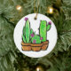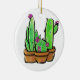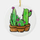 Uma ilustração de três cactos bonitos com flores cor-de-rosa em pequenos potes de terracota.