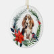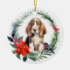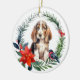 Aqui está um ornamento bonito de Feriado que é uma maravilhosa manutenção para qualquer um que ama um cão Basset Hound. A frente tem uma imagem aquosa de uma coroa de agulha de pinho, folhas verdes macios, bagas vermelhas e uma poinsettia vermelha florescendo. Um passarinho preto e vermelho permeia a coroa oposta à poinsettia florescer. O destaque é o cachorrinho marrom, preto e branco de Basset Hound que fica no centro. A parte de trás do ornamento tem a mesma imagem de coroa, sem o pássaro ou o filhote, mas com dois campos de texto personalizáveis.