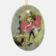 Ornamento cerâmico oval com imagem, em ambos os lados, de uma dançarina de câncer girando casacos brancos sob uma saia rosa. Ela está vestindo meias pretas e uma prostituta preta em volta do pescoço. Há homens vestidos de smoking na foto. Um é condutor e o outro está olhando do palco traseiro. Veja toda a coleção do Ornamento de Cancan nos TOUCHES ESPECIAIS | Seção Favoritos para festas.