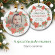 A frente deste ornamento de Feriado tem a fotografia do seu bebê enquadrada com uma poinsettia vermelha e verde e coroa de cana doce. A parte traseira do ornamento tem a mesma linha com campos de texto em vermelho e verde correspondentes ao seu próprio texto personalizado. Um presente perfeito para os avós da rua, mas você pode facilmente mudar o texto para qualquer coisa que quiser.