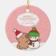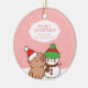 Espalhe a alegria de férias com o nosso ornamento cerâmico Capybara e Snowman. Este adorno bonito apresenta uma capybara num chapéu de Santa e um boneco de neve numa fantasia de inverno, colocada contra um fundo de neve branco e rosa. Personalize-o com um nome para criar um presente pensativo para os entes queridos. Perfeito por adicionar um toque festivo a qualquer árvore de Natal.