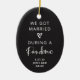 Este ornamento de Natal simples e na moda, de carvão colorido, diz: "Casamos durante uma pandemia" em uma escrita manuscrita em tom branco, e decoramos com um coração marcado. Adicione seus nomes e data de casamento também, e sua foto pessoal nas costas. Uma bela maneira de recordar e celebrar o bem deste ano!