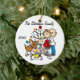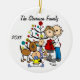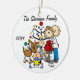 Um ornamento cerâmico redondo bonito do feriado do Natal da lembrança caracteriza uma figura família da vara que inclui um pai, uma mamã expectante, uma menina, um menino da criança, um gato, e o cão da família na frente de uma árvore de Natal decorada com áreas que você pode personalizar com seu nome de família e o ano em curso! Este ornamento bonito da lembrança do feriado faz um grande presente para que a família nova comemore um ano especial!