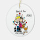 O ornamento de feriado de figuras de palito de solicitação do cliente apresenta um casal esperado em frente à árvore de feriados. Homem com cabelo louro, mulher com cabelo escuro. Também inclui um cão de laboratório amarelo e dois gatos pretos. Nomes e data adicionados, bem como texto sobre o ornamento.