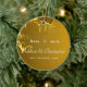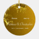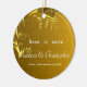 Um na moda dourado salva o adorno redondo de data, com um design de rolagem de ouro luxuoso e texto personalizado que você pode personalizar com seus próprios detalhes. Por favor, note que este elegante favor de casamento dourado foi criado para combinar um pacote de convite para casamento de cheio, RSVP, anúncios e muito mais com o mesmo design, que você pode encontrar aqui: https://www.zazzle.com/collections/elegant_golden_wedding-119011321871117695
