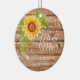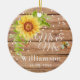 Um enfeite de cerâmica elegante para casamento com girassol amarelo rústico, composto por um fundo de grãos de madeira marrom decorado com um lindo girassol amarelo em aquarela floral com uma abelha e uma sequência de luzes. Torna-se um anúncio único de 'save the date', enchimento de meia, presente personalizado para chá de noiva, presente de noivado ou presente de casamento para guardar. Personalize com o sobrenome da noiva e do noivo e data da cerimônia de casamento.