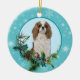 Na frente deste ornamento de Férias está um belo retrato de um cão Cavalier King Charles Spaniel enquadrado em uma tosse sagrada e evergreen. Morangos vermelhos e cones de pínus decoram os sprigs de pinho e sprigs de pinho. A imagem é colocada sobre um círculo azul pálido formado por um padrão de floco de neve azul retrô. A parte de trás do ornamento tem o mesmo fundo e círculo com o seu texto personalizado em azul.