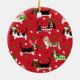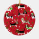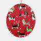 Cães de Caça-Besta com casacos castanhos, pretos, brancos e limões vestidos de roupas festivas de férias, chapéus de Santa e blárgulas com Enfeites de natal espalhados.