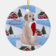 Arte original e engraçada de labrador retriever pintada por Naomi Ochiai de Japão. Design amarelo bonito de Labrador para o Natal! Você pode personalizar o texto nos ambos lado. Introduza seu nome de família para personalizar o ornamento. :)