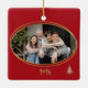 Cherry Red with 4 graphic Christmas trees in green pink and gold Christmas Card is stylish with a holiday feel. Each tree is individual and the colors are subtle and look great against the Christmas cherry red. This ornament can be personalized with your own photo, the year, your preferred holiday greeting and names. The ornament also coordinates with a range of Holiday Party stationary and party supplies. Giving a photo ornament each year should be a tradition for grandparents and family members. Yearly photo ornaments build a history to be relived every holiday season for your loved ones.