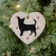 Para pais de cães, adoramos incluir nossos filhos peludos na comemoração de feriado ou evento familiar. Este ornamento com uma silhueta de Chihuahua é a maneira perfeita de comemorar seu querido cachorro. Personalize as costas com o nome do seu cão, títulos ou o seu ditado favorito. Com um padrão de impressões de pata bronzeadas e pontos azuis em um fundo bege, este ornamento deve agradar a qualquer amante de cachorros ou dono de animais de estimação.