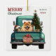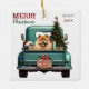 Um caminhão de coleta de retro azul lacrimogêneo carregar uma árvore de Natal decorada e pacotes de presentes neste Enfeites de natal de vidro bonito. Olhar para fora do portão é um lindo cão vermelho laranja Chow Chow. Um cartaz de madeira rústico na pára-choque diz "Feliz Natal". O texto vermelho e verde estilizado no topo à esquerda diz "MERRY CHRISTMAS", com seu nome (ou do seu cachorro) e o ano à direita. Ambos os lados têm a mesma imagem.