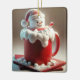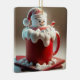 A large marshmallow snowman with a Santa hat sits atop a red mug filled hot chocolate and creamy foam.