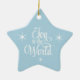 Star ornament is shown in blue and white with a stars Joy to the World print.