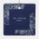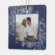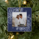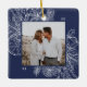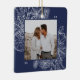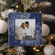 Um ornamento de feriado moderno e elegante que enquadra sua foto quadrada favorita em um quadro perfeitamente detalhado com ramos de pinheiro, folhas de inverno, anis estrelado e fatias de citrinos em um rico fundo azul-marinho. Personalize a parte de trás deste único ornamento fotográfico de Natal com o seu nome familiar.