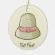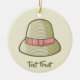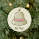 Chapéu amarelo com fita e arco cor-de-rosa.