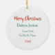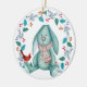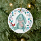 Neste adorável ornamento Holiday, um adorável coelho azul empalhado com orelhas disquetes veste um cachecol de inverno, e se senta olhando para um pássaro cardeal vermelho empoleirado em seu pé. O coelho está rodeado por uma coroa azul e uma coroa vermelha. O verso do ornamento mantém o texto personalizado em cinco campos fáceis de alterar. Bonito para qualquer criança.