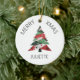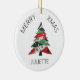 Apresenta uma colagem de árvore de Natal em uma paleta colorida de vermelho e verde. Personalize com um nome na frente e um nome "de" no verso.