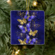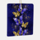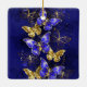 Composição de borboletas luxuosas de safira e joias de ouro em fundo azul texturizado.