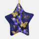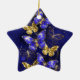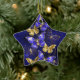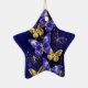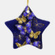 Composição de borboletas luxuosas de safira e joias de ouro em fundo azul texturizado.