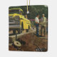 Design de ilustração Vintage da indústria empresarial com um arquiteto e empreiteiro geral ao lado de um caminhão de coleta de trabalho amarelo. Os operários estão olhando alguns planos de impressão azul em um local de construção antes que o inspetor apareça para assinar o projeto.