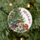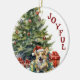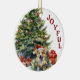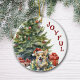 Na frente deste ornamento de Feriado está a imagem de um Cachorro Pembroke Welsh Corgi vestindo um chapéu de Papai Noel vermelho e branco. O cachorro se senta em frente a uma árvore decorada de Férias, e é envolto em uma corda de luzes festivas. O texto vermelho do lado diz "JOVEM". No verso, o texto vermelho e verde diz MERRY CHRISTMAS", e há campos de texto adicionais para você personalizar. Faça-o dizer o que quiser!