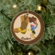 Um Enfeites de natal de vaqueiro fofo personalizado com uma criança fazenda se inclinando contra uma bota gigante de vaqueiro lançando seu chapéu marrom com uma estrela amarela. Um presente infantil de um país excelente personalizado com seu nome.