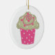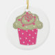 Um cupcake doce num revestimento rosa quente com bolinhas brancas. Suores e corações para bebês no topo.