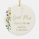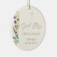 This floral Baptism photo keepsake ornament features wildflowers and a cross with stylish script typography on a soft cream background.