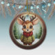 Rustic Holiday Reindeer, Xmas Deer, Christmas tree ceramic ornament featuring a round, brown wooden frame. Inside the decoration, a cute baby wildlife animal, deer with antlers, in a cartoon graphic style, wearing a coat and scarf, standing in the foreground. In the background, winter wonderland snow scene, completing the holiday season charm of this delightfully unique decoration. Same doe Image is on the front and back. ensuring that no matter how the fawn decor turns, it always looks festive and complete. 🦌🎄