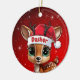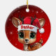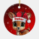 Dasher! Celebrate the holiday season with this festive round ceramic red ornament featuring an endearing woodland forest animal cartoon graphic of a cute baby reindeer wearing a Santa hat. Perfect deer with antlers for decorating your tree or as a thoughtful gift, this whimsical doe decor makes a cherished keepsake for years to come. Customize by changing the text, the font, the font color, or remove the text. You can even transfer this design onto other products. Enjoy this design your way! Check out ForestBabies Xmas Deer Collection for matching decorations. 🎄🦌