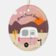 Esse adorno bonito tem uma cena do deserto com um pequeno trailer de viagem entre os cactos. O sol está ascensão atrás das montanhas e um lagarto rosa olha para ele. O texto editável em curva diz Home Sweet Home. Este pequeno ornamento vai parecer excelente na sua árvore e é também uma pequena decoração para seu trailer RV, viagem ou carro.