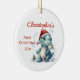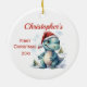 Celebrar o primeiro Natal de uma criança com este adorável ornamento de Natal de dinossauro bebê, que mostra um dinossauro azul de desenho vestindo um chapéu de Natal vermelho, O fundo apresenta neve, flocos de neve e árvores de abeto. Todo o texto pode ser alterado conforme necessário. Personalize com nome e ano e personalize com o evento. O Natal de 1rua também pode ser alterado se você quiser ter segundo ou 3º Natal ou qualquer outra coisa para fazer disso uma decoração especial de árvore de Natal. Excelente de dar de presente aos avós e a outros familiares ou de comprar como guardiã.
