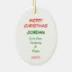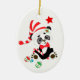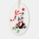 Um urso panda branco e preto bonito veste um boné branco e vermelho estocando e segura uma bengala doce na frente deste adorno feriado. Alguns bolbos de árvores vermelhas, azuis e verdes estão espalhados pelo urso. Ele veste uma gravata vermelha de arco polkadot. Uma estrela vermelha brilha sobre ele. A parte traseira tem quatro campos de texto em vermelho e verde para você personalizar. É bonito um avô dar a um neto, ou um pai dar a uma filha ou filho.