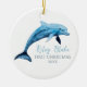 O primeiro ornamento cerâmico de Natal de uma menina ou de um menino com uma ilustração mínima de golfinho. Personalizado com o nome do bebê e o ano. Design duplo. Ideal recém-nascido para os Feriados.