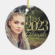 Foto colorida do cheio e uma classe ousada de design de texto 2023 com nome próprio do formando em uma fonte de script para a foto de destaque. Escolha uma cor escolar ou outra cor favorita para a parte de trás deste adorável ornamento ou personalize ainda mais com outra foto. O design pode ser redimensionado e realocado na foto por meio de mais personalização, conforme preferido.